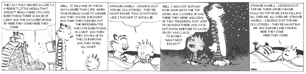 [january 6, 2003]all is white and getting whiter still. indigo girls are singing: "thought the time was passed when i could find beauty in the birds." there is a kind of cold beauty to things. like the snow. it's soft, and white and beautiful to look at, yet when you touch it, it's first cold and then it melts. i'm sure this is a metaphor for something. das sagt sich so leicht. und lebt sich so schwer. i'm hungry but i've decided not to eat. it must be possible to disappear. "now i'm trying to get back what i know that i should be" eva just mailed. seems like i have two dates on tuesday night. thought about that calvin & hobbes comic and i think it works so perfectly [well, at least for me] with the lyrics of "strange angels" because it simply fits the mood of the song: for me "strange angels" had always been about feeling rather small and insignificant, about being subjected to other people's will (or "god's" or chance's) and i think the character of calvin impersonates this perfectly: being small and powerless and the only thing you can fight the world with is some philosophic|poetic defiance. the other song by laurie which for me has a similar feeling is "dog show". und why is it snowing? and is it really snowing? or is it just my metaphor mind?